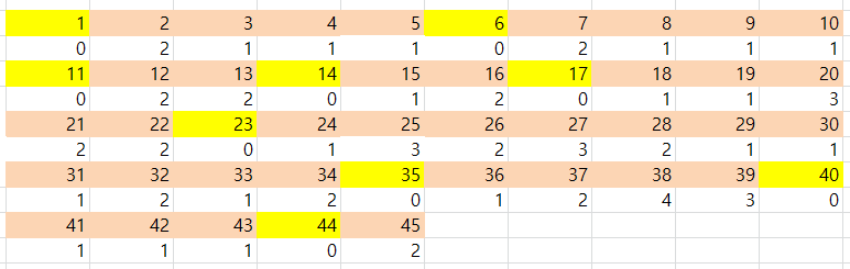 아래 표에서 노란색 번호가 최근 10회차 1154회~1163회 동안 당첨번호로 나오지 않았던 번호들입니다.